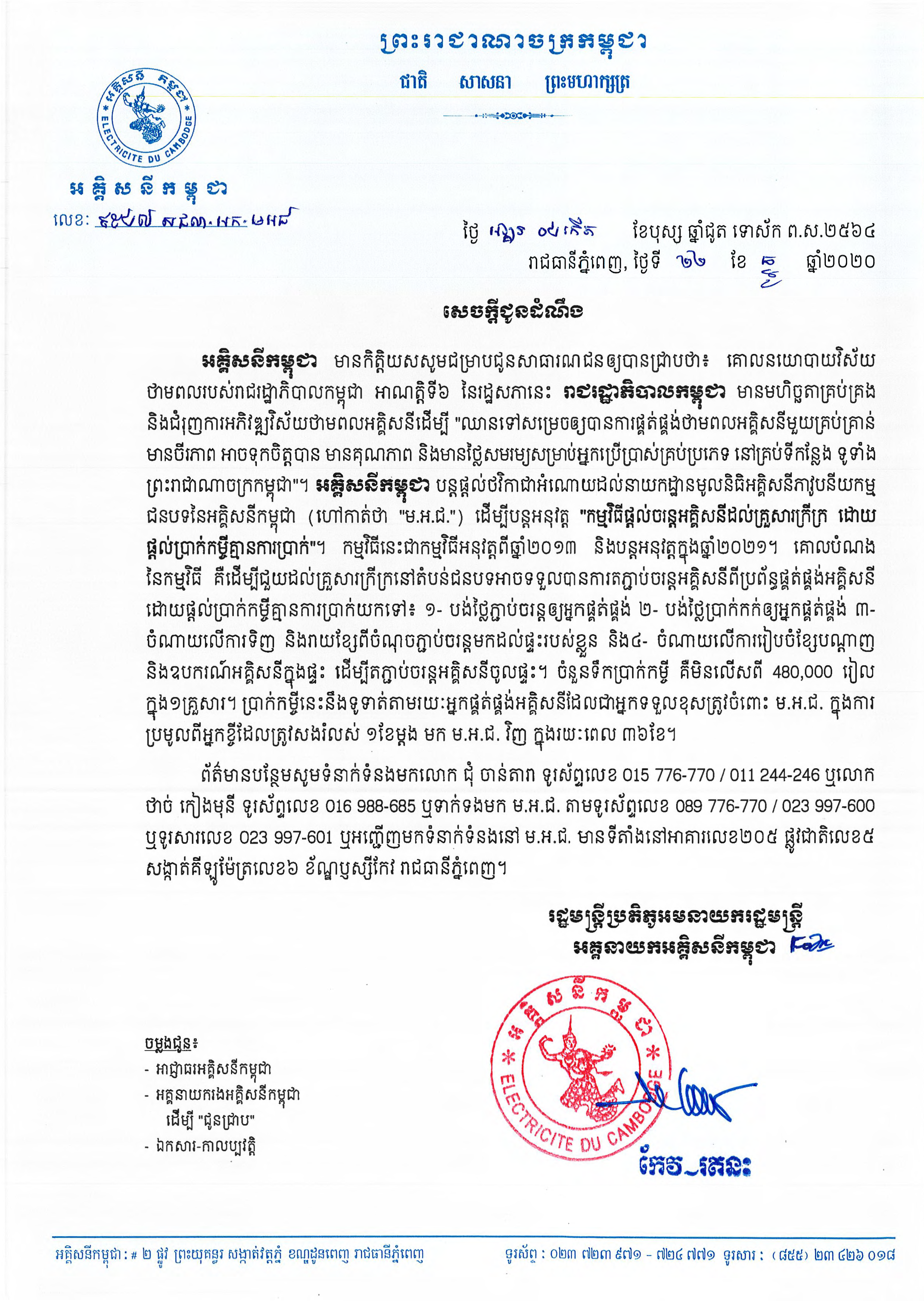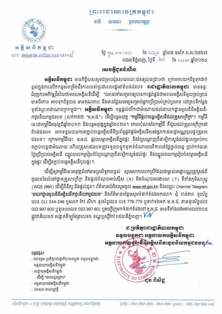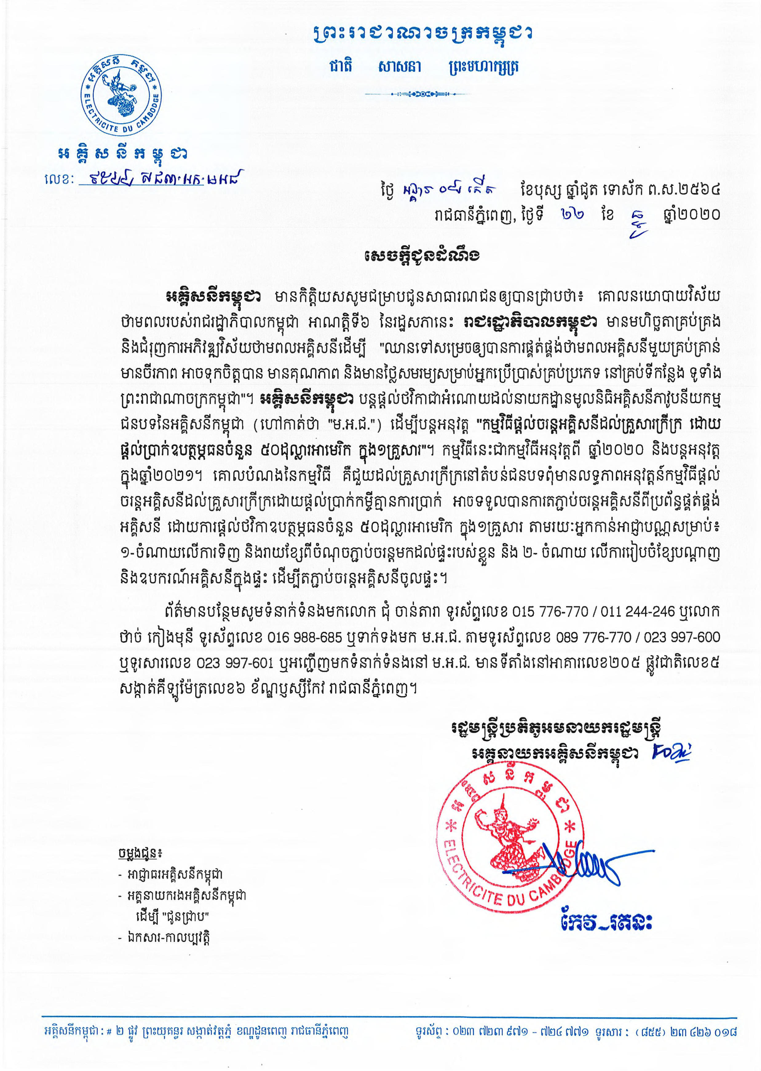 សេចក្តីជូនដំណឹង ស្ដីពីកម្មវិធីផ្ដល់ចរន្តអគ្គិសនីដល់គ្រួសារក្រីក្រ ដោយផ្ដល់ប្រាក់ឧបត្ថម្ភធនចំនួន ៥០ដុល្លារអាមេរិច ក្នុង១គ្រួសារ, (២០២០)