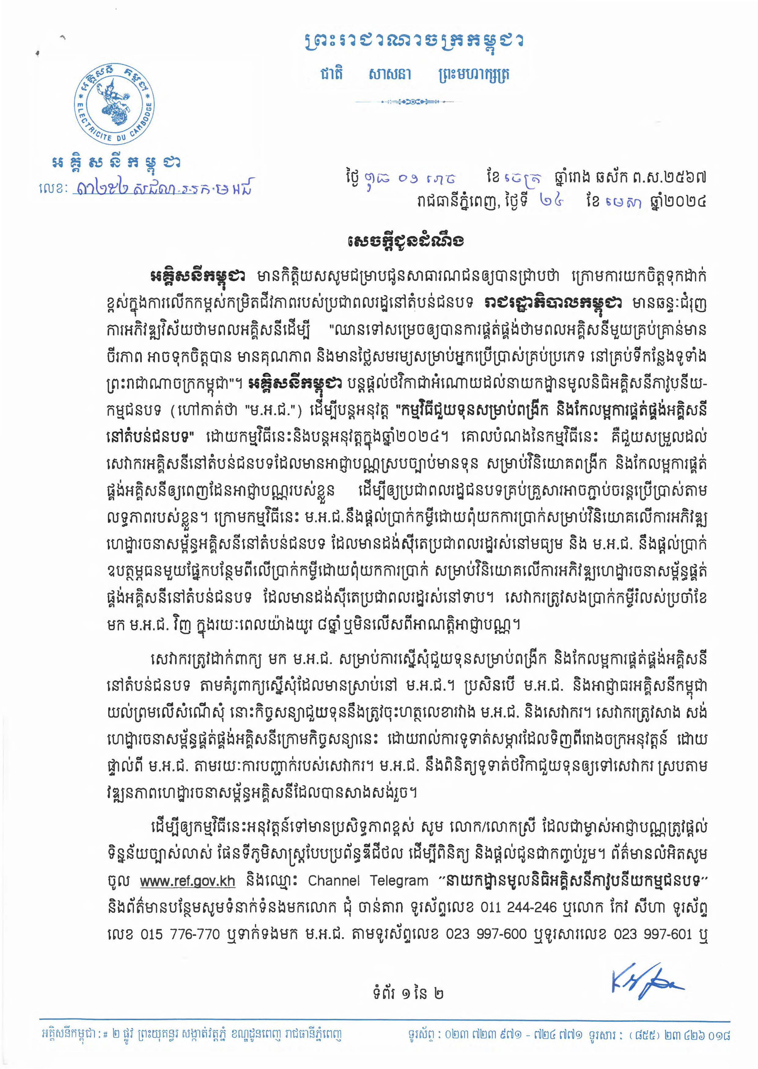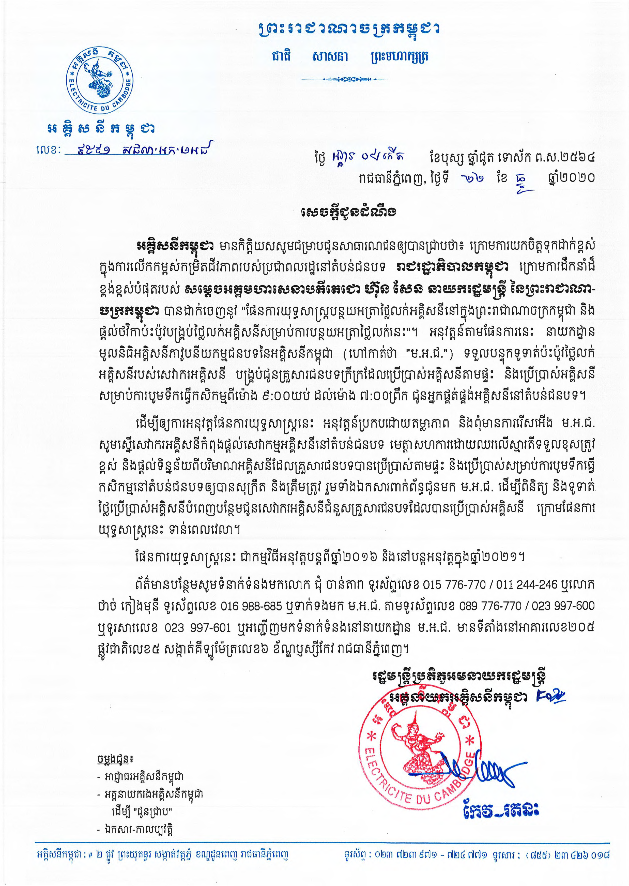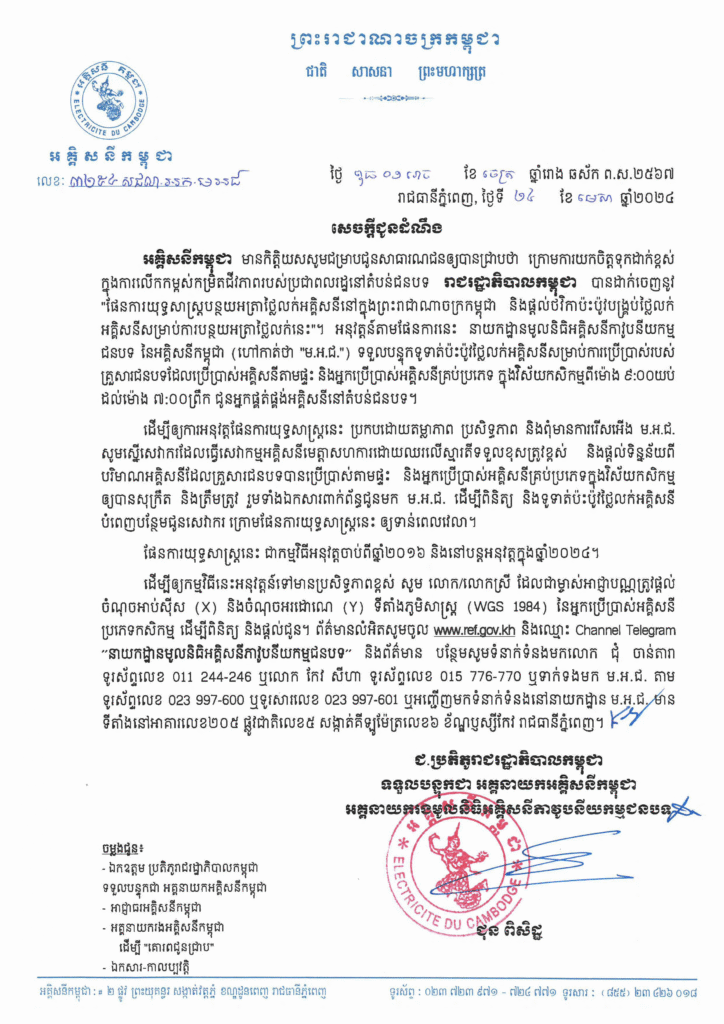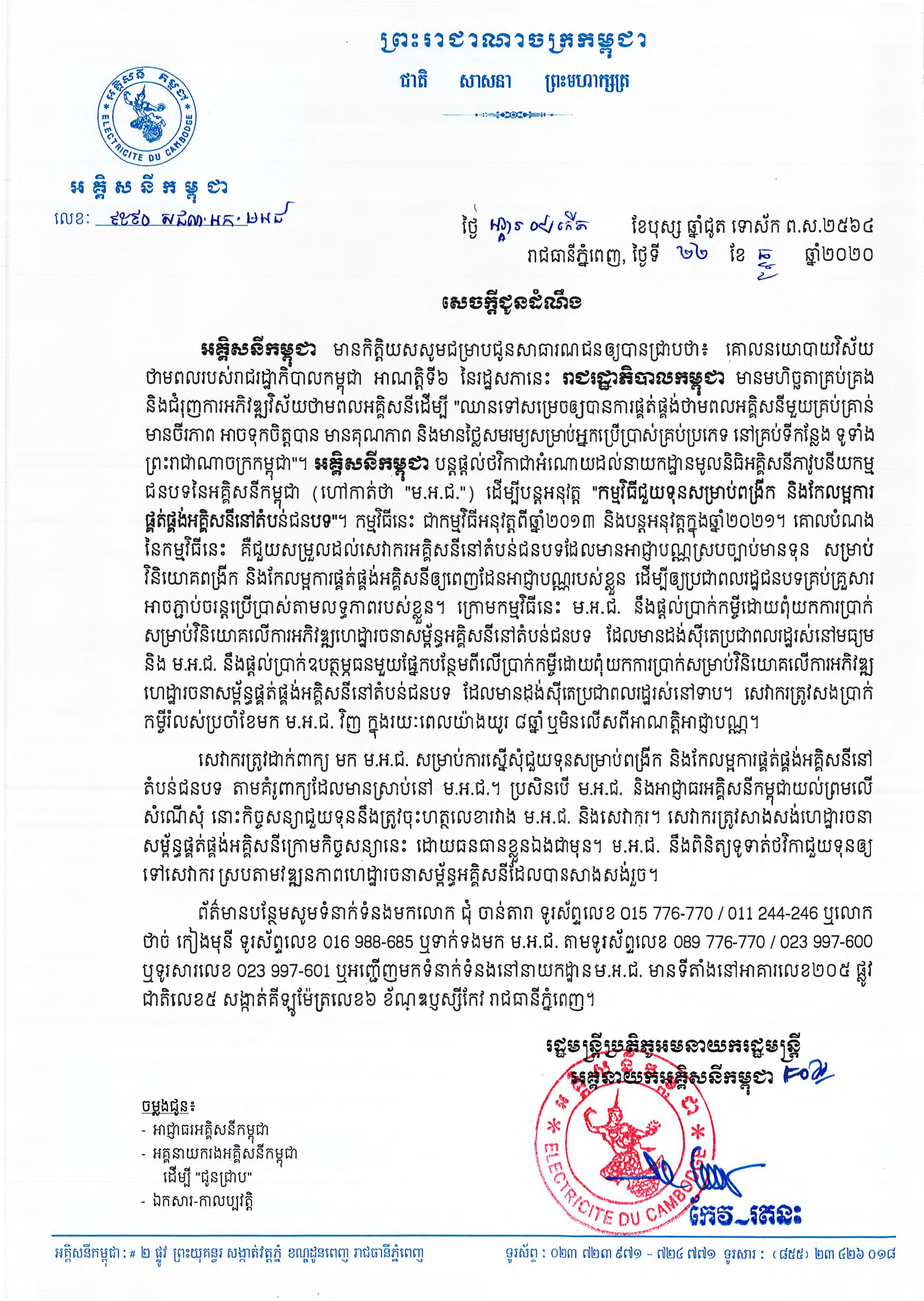 សេចក្តីជូនដំណឹង ស្ដីពីកម្មវិធីផ្ដល់ចរន្តអគ្គិសនីដល់គ្រួសារក្រីក្រ ដោយផ្ដល់ប្រាក់ឧបត្ថម្ភធនចំនួន ៥០ដុល្លារអាមេរិច ក្នុង១គ្រួសារ, (២០២០)