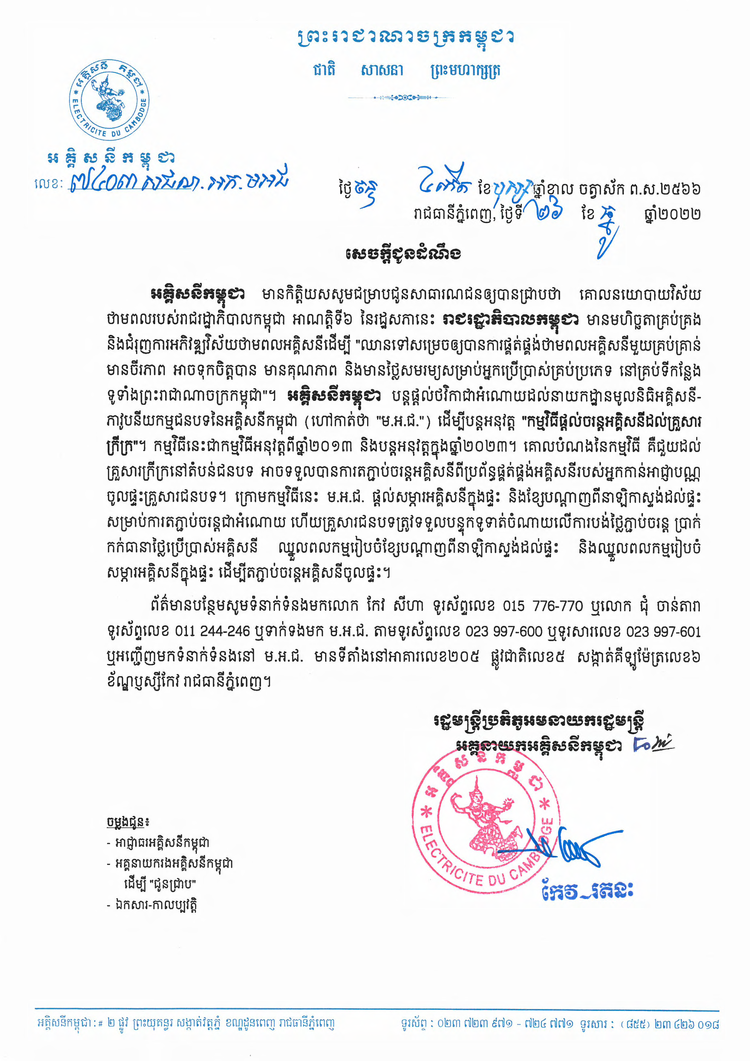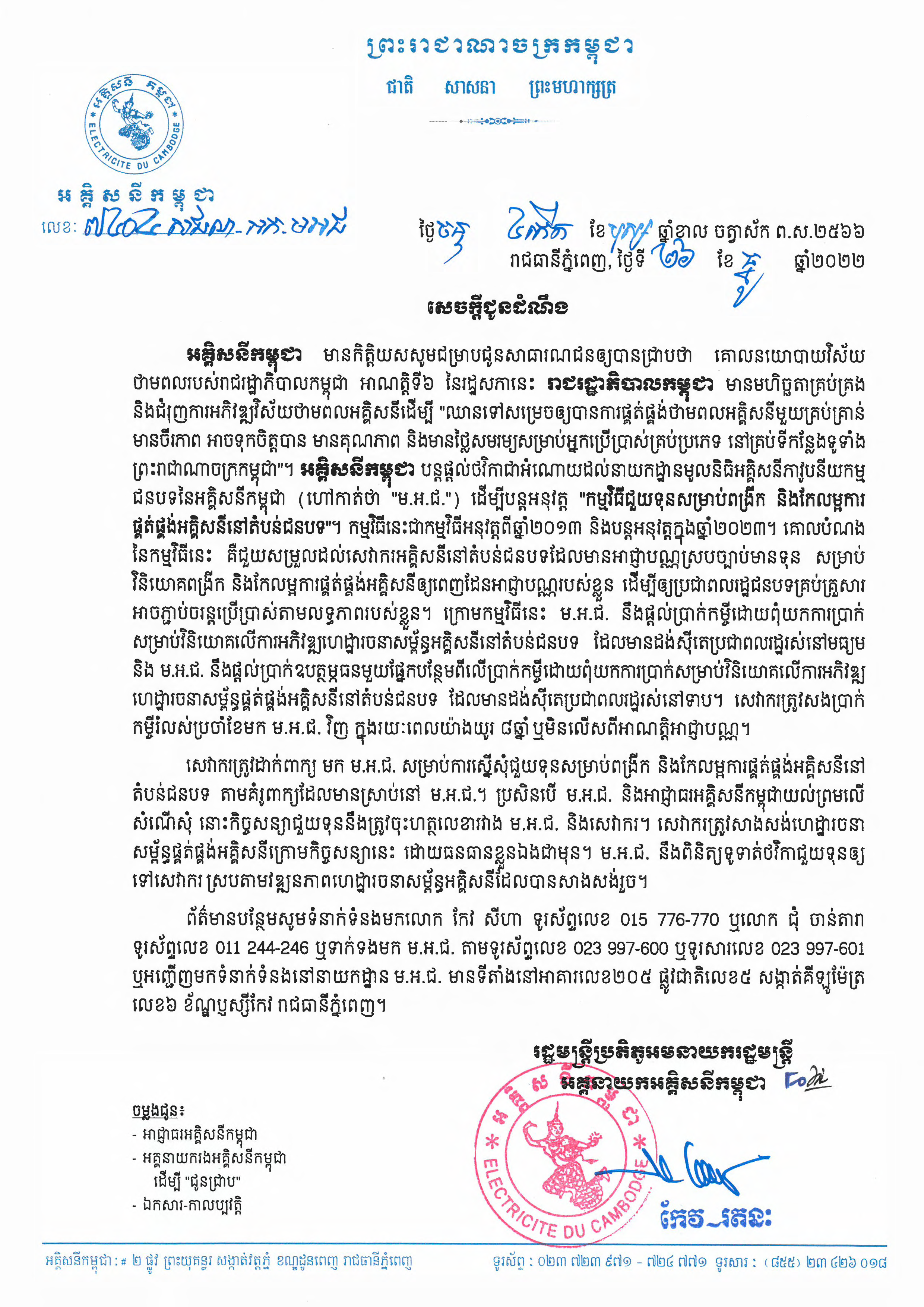 សេចក្តីជូនដំណឹង ស្ដីពីកម្មវិធីផ្ដល់ចរន្តអគ្គិសនីដល់គ្រួសារក្រីក្រ ដោយផ្ដល់ប្រាក់ឧបត្ថម្ភធនចំនួន ៥០ដុល្លារអាមេរិច ក្នុង១គ្រួសារ, (២០២១)
